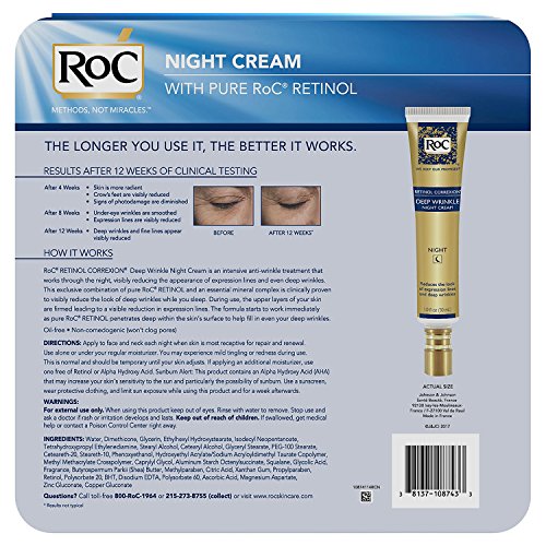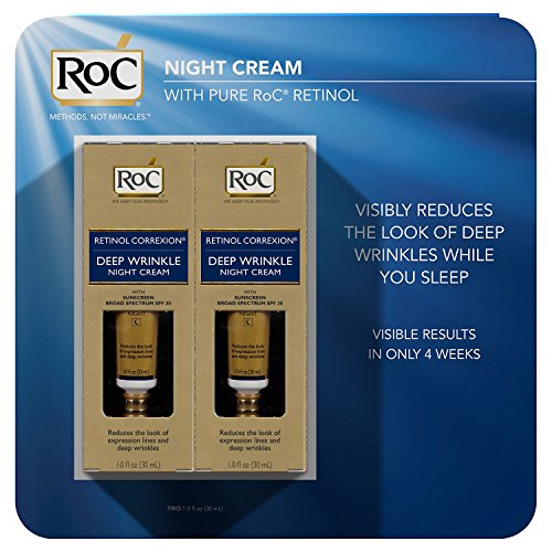 Daily Moisturizer RoC Retinol Correxion Deep Wrinkle Daily Moisturizer reduces the look of expression lines and deep wrinkles to reveal younger looking skin. This daily moisturizer has been clinically proven to show visible results in just 12 weeks. It also contains broad spectrum SPF30 sunscreen to protect skin from UVA and UVB rays, which may contribute to premature aging. RoC Retinol Correxion Deep Wrinkle Daily Moisturizer is oil-free and noncomedogenic. Night Cream RoC Retinol Correxion Deep Wrinkle Night Cream visibly reduces the look of expression lines and deep wrinkles while you sleep. This cream, containing pure RoC Retinol and an essential mineral complex, leaves skin smooth and younger looking. Tested by dermatologists and clinically proven to visibly reduce both fine lines and deep wrinkles in 12 weeks, RoC Retinol Correxion Deep Wrinkle Night Cream is oil-free and noncomedogenic.Feature