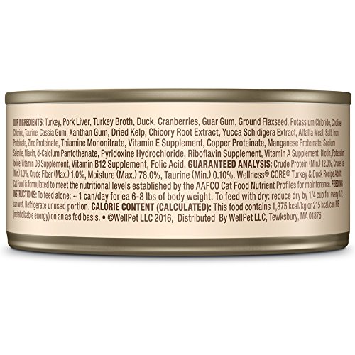 Wellness CORE Natural Grain Free Wet Canned Cat Food, Turkey & Duck, 5.5-Ounce Can, Pack of 24