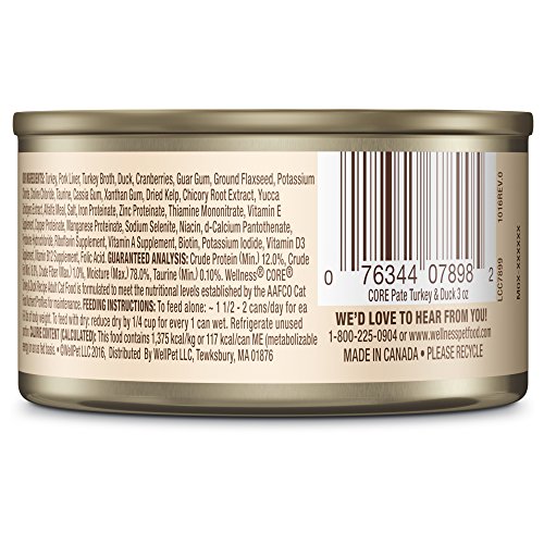 Wellness CORE Natural Grain Free Wet Canned Cat Food, Turkey & Duck, 3-Ounce Can, Pack of 12