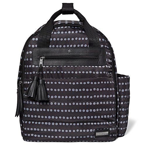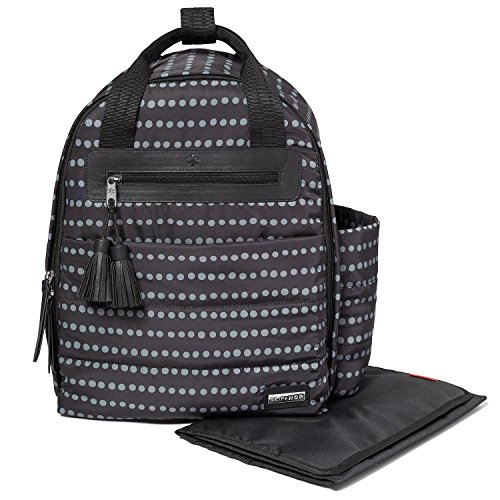 Embrace effortless style with our ultra-lightweight diaper backpack. When you're overloaded with baby gear, every ounce counts. Our chic-yet-practical diaper bag holds the essentials without weighing you down. Water-resistant, lightweight materials and luxe vegan leather details give the Riverside Diaper Backpack the perfect mix of style and function. Product Features: - Eight pockets, including two front zip pockets and two insulated side bottle pockets - Easy access changing compartment holds tablets and laptops up to 15" - Extra-wide, dual zip opening, adjustable straps and convenient top handles - Made of lightweight, water-resistant fabric - Vegan leather details including removable tassel charm - Hangs neatly on a stroller with the included stroller straps - Includes cushioned changing pad - PVC-free, Phthalate-free - Size (inches): 13.5l x 7w x 15.75h; (cm): 34l x 18w x 40h Instructions: - ATTACH IT TO YOUR STROLLER: Locate the stroller straps on the backpack straps. Unclip and wrap around the handlebars, then re-clip to D-ring.Feature
