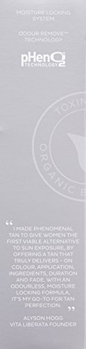Phenomenal tan lotion leaves skin beautifully tanned, amazingly nourished, and healthy-looking for up to two to three weeks. The fast-absorbing lotion formula gives instant natural bronzing and develops to a deep, natural-looking tan. Pheno2 technology encourages a tan that lasts up to four times longer than regular tans with a patch-free, perfect fade while certified organic botanicals and moisture locking technology give 72-hour hydration. Odor remove technology ensures no smell whatsoever while the included tan mitt ensure a fast, easy, streak-free application and natural-looking result. Regardless of your natural skin tone, choose medium for a natural golden bronze, and dark for a deep tan.Feature
