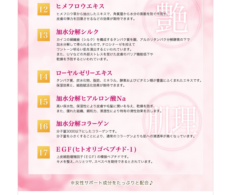水、グリセリン、カプリル酸ヤシ油アルキル、スクワラン、ヒトオリゴペプチド‐1、アセチルデカペプチド‐3、グリチルリチン酸2K、ヒアルロン酸Na、加水分 解ヒアルロン酸、加水分 解エラスチン、加水分 解コラーゲン、加水分 解シルク、セラミド2、アラントイン、アスコルビルグルコシド、ヒメフウロエキス、ローヤルゼリーエキス、褐藻エキス、紅藻エキス、緑藻エキス、オウバクエキス、アロエベラ葉エキス、ベタイン、ポリクオタニム‐51、カルボマー、(アクリレーツ/アクリル酸アルキル(C10-30))、クロスポリマー、PEG-150、ジグリセリン、トコフェロール、BG、水酸化K、トレハロース、酸化銀、ホウケイ酸