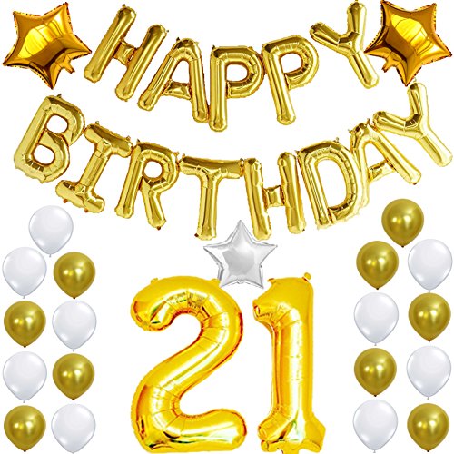 21st BIRTHDAY DECORATIONS PARTY KIT - Happy Birthday Balloon Banner, Number 21 Balloon Mylar Foil, Gold White Latex Ballon, Perfect 21 Year Old Party Supplies Free Printable Bday Checklist