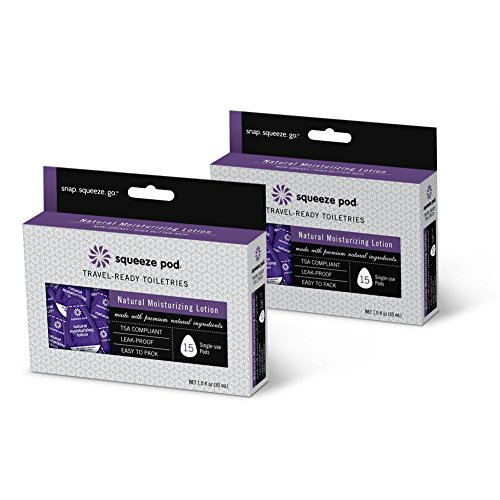 Squeeze Pod is a travel-ready line of travel size personal care products conveniently packaged in patented, single-use "pods" for pampering and problem-solving on the go. All Squeeze Pod products are manufactured in the USA using premium natural ingredients. Perfect for travelers and active people who squeeze the most out of life, Squeeze Pods are TSA Approved and easy to pack or tuck in a pocket, purse, carry-on or gym bag. We're proud our products are vegan and certified cruelty-free by PETA. Squeeze Pod Travel Size Natural Moisturizing Lotion is made with a quartet of natural moisturizers-shea butter, aloe vera, algae extract and jojoba extract-and infused with essential oils of grapefruit and bergamot for a citrus scent that soothes the senses. This hardworking multi-tasker is the perfect travel companion: Use it to protect hands, hydrate post-shower, soothe after a shave, remove makeup and keep skin feeling supple and looking youthful. Simply squeeze into the palm of your hand, then apply lotion to face, body or hands using a circular motion until it is absorbed by the skin. Squeeze Pod Travel Size Natural Moisturizing Lotion has a shelf life of two years and can be stored in all environments. Plus, our super-convenient lotion pods will never leak in your bag or on your clothes. Take Squeeze Pod Travel Size Natural Moisturizing Lotion on the go for pure, non-greasy, non-comedogenic dry skin relief.Feature