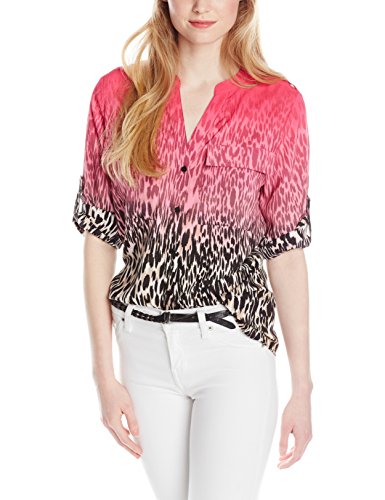 Printed button-front shirt featuring collarless V-neckline and dual flap pockets at chest