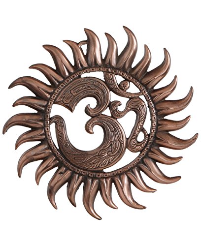 Om bursts forth in the center of a blazing copper colored sun in this rustic wall hanging. Natural variations in the piece's surface give it appealing antique appearance. A notch for hanging is incorporated into the piece's design. This item is made of blend of metals; blue oxidation marks may be present as result of the metal's natural characteristics. This item may feature slight variations in color, appearance and finish.