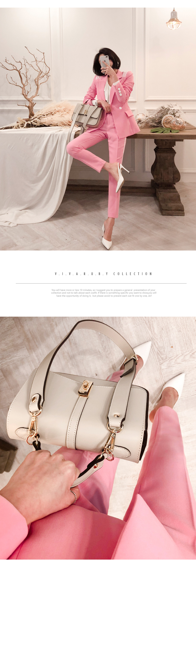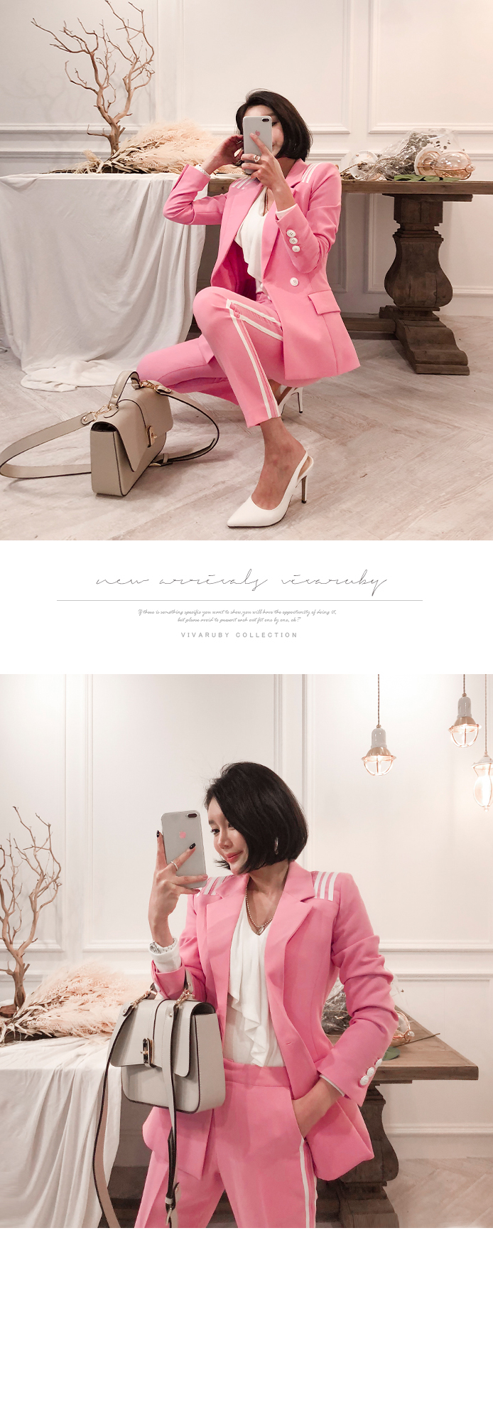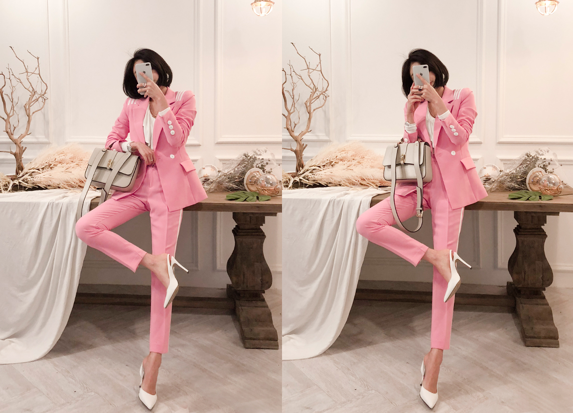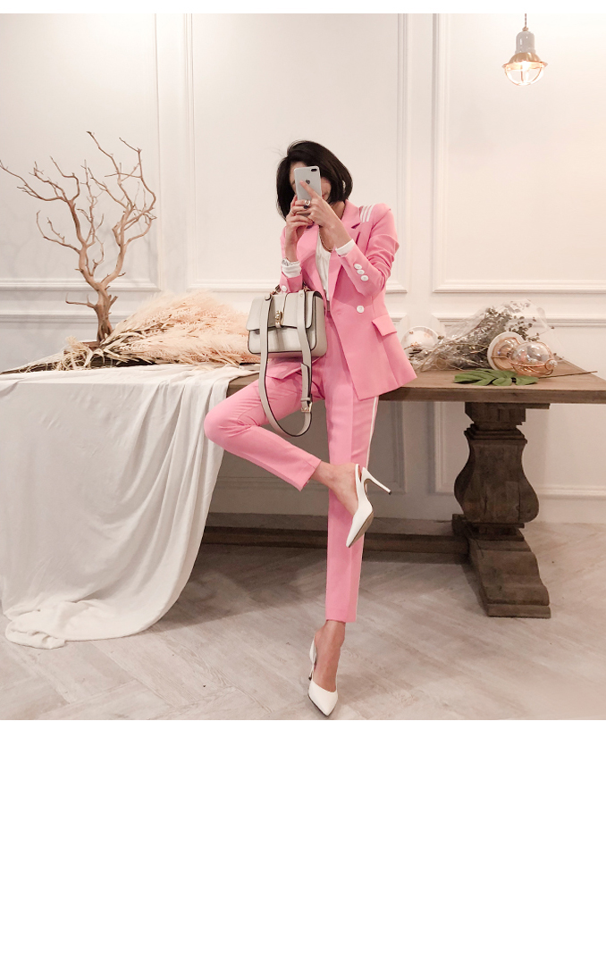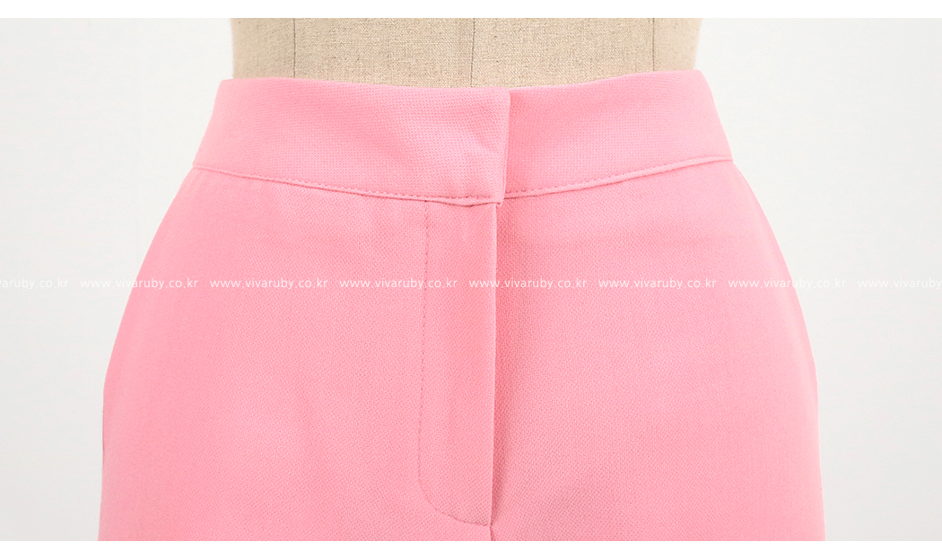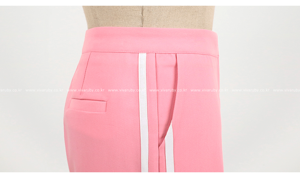 ソフトなピンクカラーでポイントとなるのパンツです