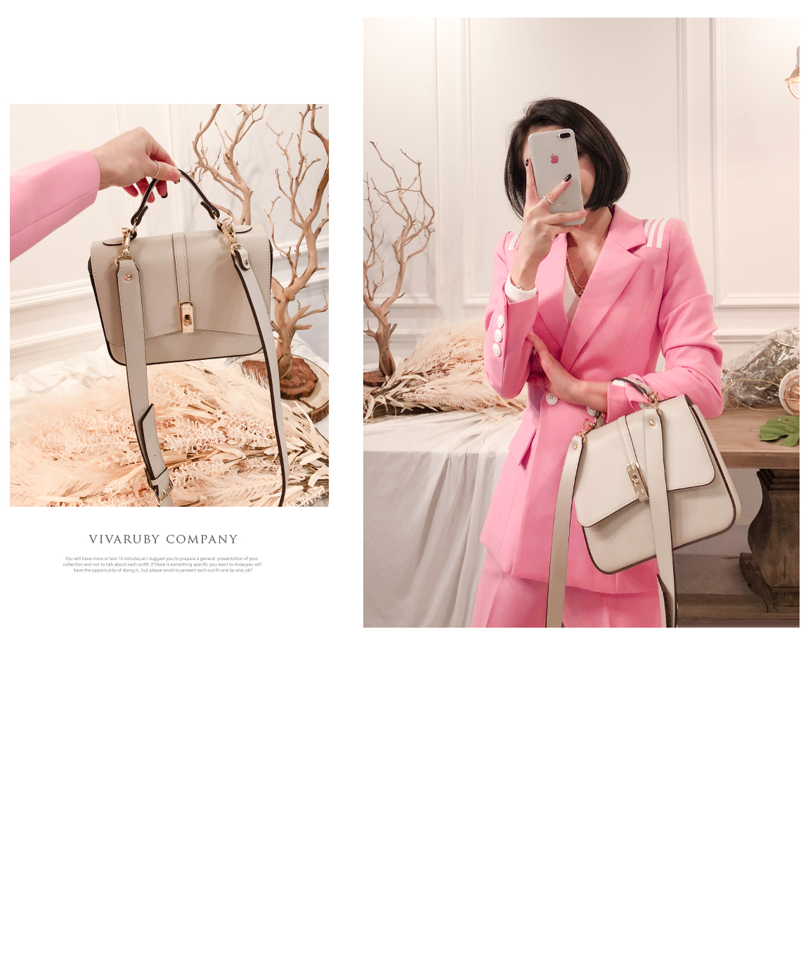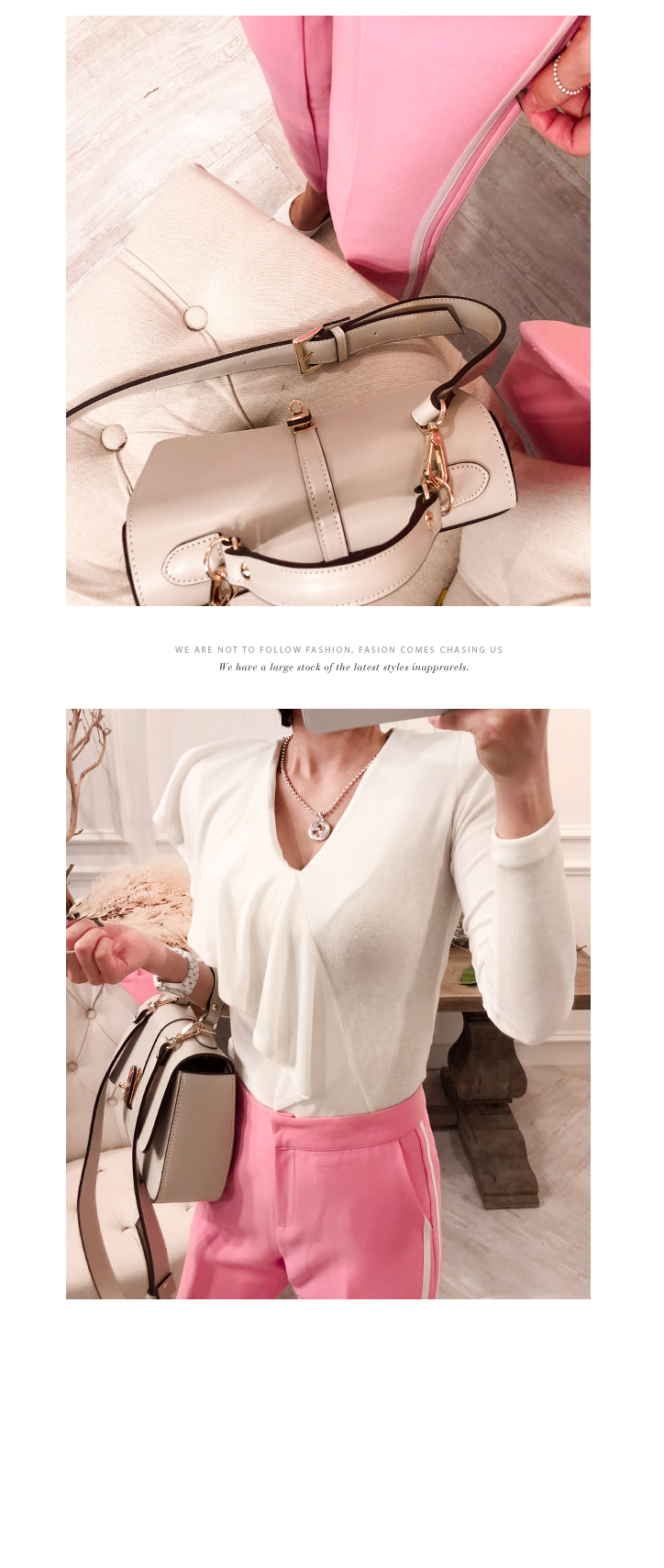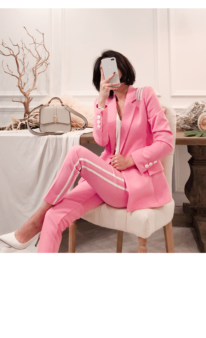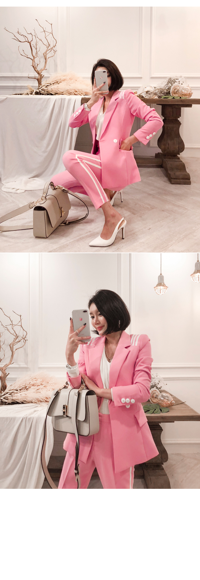 ソフトなピンクカラーでポイントとなるのパンツです