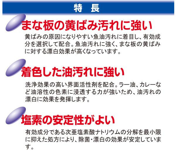 | 黄ばみの原因になりやすい魚油汚れに着目し、有効成分を配合。魚油汚れに強く、まな板の黄ばみに対する漂白効果が高くなっています。また洗浄効果の高い界面活性剤を配合しているので着色した油汚れの漂白に効果を発揮!!ふきん、エプロン、食器などの漂白におすすめです。 |