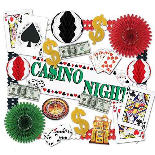 Beistle 55148 Casino Decorating Kit. This decorating kit contains 24 pieces of decorations. Included in this kit are 2 pieces of 12 foot long black and white arcade garlands, 2 pieces of 12 foot long red and white arcade garlands, 3 pieces of 7.5 inch by 17.5 inch $100 Bill cutouts, 4 pieces of 14 inch to 18 inch Vegas cutouts, 3 pieces of 16 inch $ sign cutouts, 2 pieces of 14 inch red and white tissue balls, 1 piece of a 19 inch black and white tissue ball, 4 pieces of 25 inch playing card cutouts, 1 piece of a 25 inch green tissue fan, 1 piece of a 25 inch red tissue fan and 1 piece of a 21 inch by 5 feet wide Casino Night sign banner. Decorate a room for a casino night party!