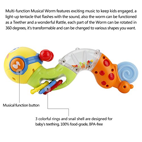 - Multi-function Musical Worm features exciting music to keep kids engaged, a light-up tentacle that flashes with the sound, also the worm can be functioned as a Teether and a wonderful Rattle, musical worm come with 6 classic nursery rhymes
