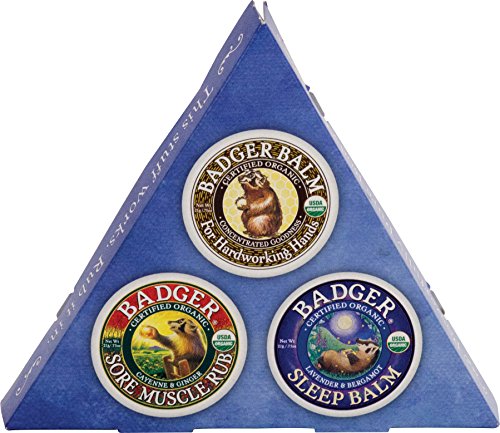 - Contains one .75oz tin of: Badger Balm, Sleep Balm, and Sore Muscle Rub