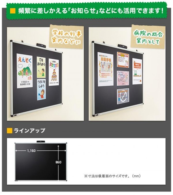fk094igrjsノリやピンは不要!静電気でラクラク掲示!微弱な静電気だから触っても「ビリッ」ときません。 製造国:中国 素材・材質:アルミ、ABS樹脂、PVC 商品サイズ:本体:約W1200×D25.5×H940mm(最薄部:15.6mm)、吸着面:約W1150×H850mm 重量:約3.8kg(電池含まず) 仕様:電源:単3形アルカリ乾電池×4本(別売)動作時間:約9ヶ月(電池種類及び使用環境により異なります)使用環境/使用温度範囲:5~40度、保存温度範囲:-10~60度 セット内容:本体、吊り下げ部品(2セット)、取扱説明書(保証書付、保証期間:お買い上げから1年間)※壁などに取り付ける際のネジは同梱していません。 ※サプライヤー直送品 ご注文後3~4営業日後の出荷となります