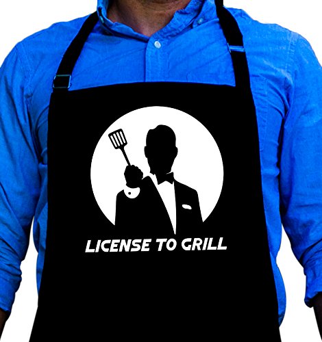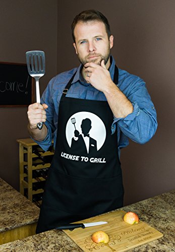 BBQ Grill Apron - Funny Apron for Men Gift Idea - License To Grill - One Size Fits All Chef Apron Black - High Quality Poly/Cotton 4 Front Utility Pockets, Adjustable Neck and Extra Long Waist Ties