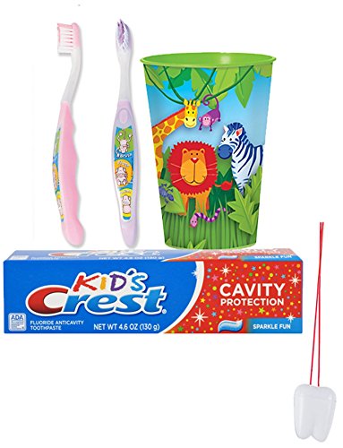 -. Binding : Health and Beauty -. Brand : Crest -. EAN : 0761656264405 -. Feature : Toddlers Little Teeth toothbrush is specially designed by dental experts for children 3+ years and have a range of colourful characters to help engage kids and encourage them to brush. / (2) SmileCare Toddler Brush Floss Smile Monkey ToothBrushes In Pink & Purple / (1) Crest Kids Cavity Protection Sparkle Fun Toothpaste, 2.7-oz. Tubes / (1) Jungle Animal 16 oz Mouthwash Rinse Cup. / Plus Bonus "Remember to Brush" Visual Aid Tooth Saver Necklace. Hang it in their bathroom or by their bed so they remember to keep their chompers sparkly fresh. You could also use these tooth charms to save one of your child's baby teeth. -. IsAdultProduct : 0 -. Label : Smile Maker -. Manufacturer : Smile Maker -. MPN : Gum Brands -. PackageQuantity : 4 -. PartNumber : Gum Brands -. ProductGroup : Health and Beauty -. ProductTypeName : HEALTH_PERSONAL_CARE -. Publisher : Smile Maker -. Studio : Smile Maker -. Title : Jungle Animal's 4pc. Bright Smile Oral Hygiene Set! Girl's "Monkey See Monkey Do" Manual Toothbrush, Crest Kids Sparkle Fun Toothpaste & Mouthwash Rise Cup! Plus Bonus "Remember to Brush" Visual Aid! -. UPC : 761656264405