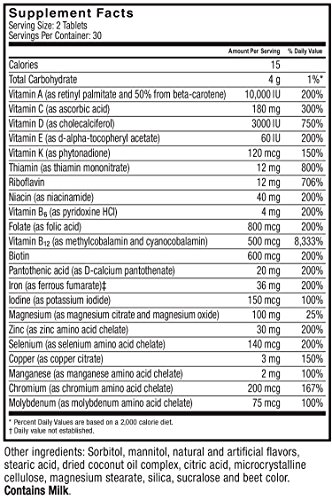 -. Feature : Contains Vitamins A, C, D, E, K, Thiamin, Niacin, B6, / Folate, B12, Biotin, Magnesium, Iodine, Zinc, / Selenium, Copper, Maganese, Chromium, Molybdenum