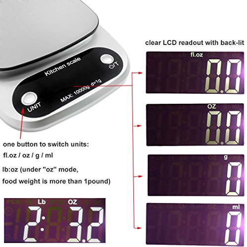 - The capacity is up to 10kg / 22lb / 10000ml / 338. 14fl.oz and precious within 0.1oz / 1g; Big Unit & Power/Tare buttons; One UNIT button converts 4 different weighting modes instantly: g / oz (lb:oz) / ml / fl.oz