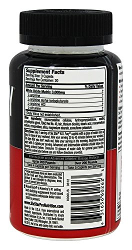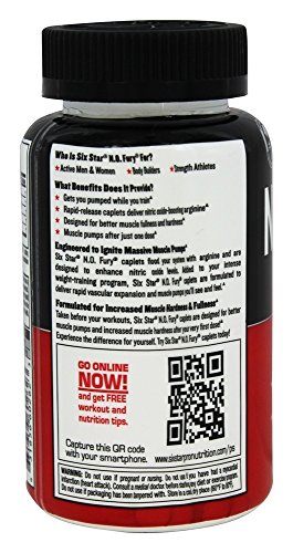 Studio : Six Star Publisher : Six Star Binding : Health and Beauty Product Description Improve your fitness level and groom yourself using the Six Star Pro Nutrition Elite Series Professional Strength Caplets. They are specially designed to enhance massive muscle pumps. These caplets contain nitric oxide boosting arginine, which promotes muscle growth and better blood circulation to vital organs. With careful formulation, these Six Star N. O. Fury caplets provide amplified strength for longer workouts. The Six Star Pro Nutrition Elite Series Professional Strength Caplets are to be taken before workouts, to tone your body and improve stamina. Hit the gym with greater confidence next time using the nutrition dietary supplement. 0