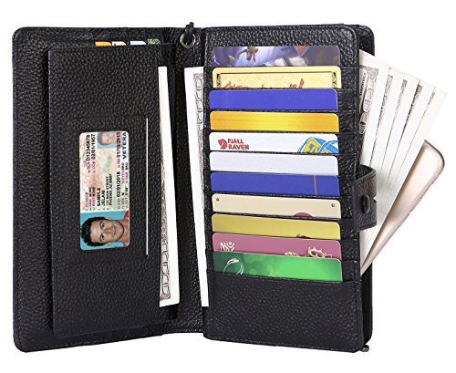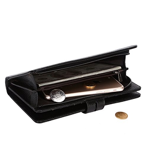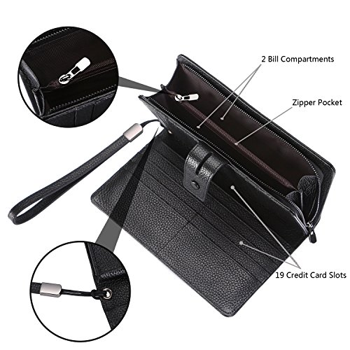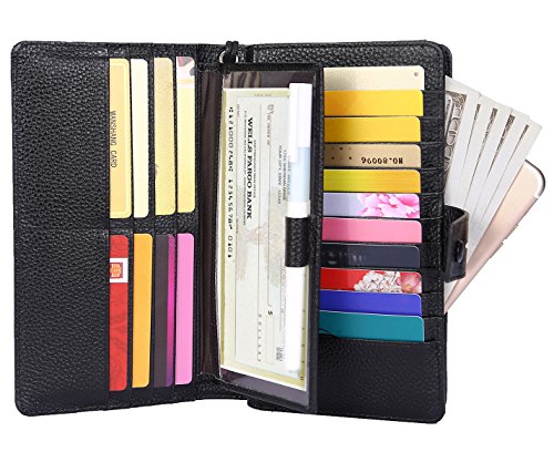 - TOP QUALITY GENUINE LEATHER - Made of top layer Cowhide Leather. Soft classy and durable. Plenty of room for 19 credit cards, 1 ID window, 1 passport pocket (can fit 2-3 passports), 1 removable checkbook cover with 1 pen holder(can used as a checkbook wallet), 1 exterior zippered pocket reveals 2 additional pockets for storage cash, cellphone(can fit iPhoneX 7/8 plus)and a zippered coin pouch.