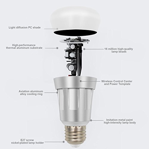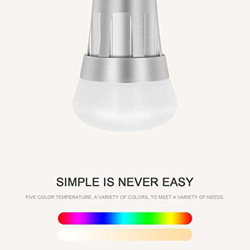 Studio : Kimitech Publisher : Kimitech Binding : Kitchen Product Description Fashion and High Quality Life Imagine: you are drinking coffee, sitting in the living room, listening to the music, and then take the remote control to select what colors or modes of the LED light bulb you want, sometimes lighting jump, sometimes lighting fade. What a wonderful night! DIY color/brightness/jump frequency freely.Independent design, more pure white than RGB, can be used for lighting.Using advanced wireless transmission technology,long remote control distance.Multiple lighting pattern, suitable for showcase, residential, office, hotel, shop,exhibition room, landscaping etc. Scene Change Use the "Reading" mode when you want to read favorite books and use the "Leisure" mode when you take a nap or listening music.Perfect for home, store, super market, office, KTV, party, and other lighting and decoration. Function Perfect for home, store, super market, office, KTV, party, and other lighting and decoration. Schedule Actions Schedule your bulb to turn on or off at specific time. Wake up in the morning to your favorite colors. Improve your home security when you're not home by scheduling your lights to turn on and off giving the appearance that you're home. Just have your smart lights work around your life! What's in the box: Smart bulb User manual