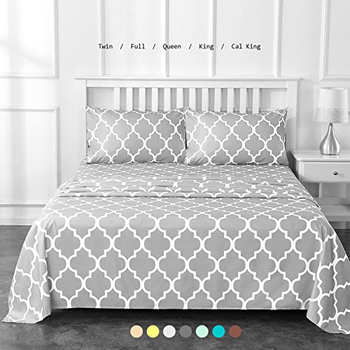 Bed Sheet Set by Prime Bedding - Microfiber Sheet Quatrefoil Pattern - Deep Pocket, Hotel Collection, 4 Piece (Queen, Gray)