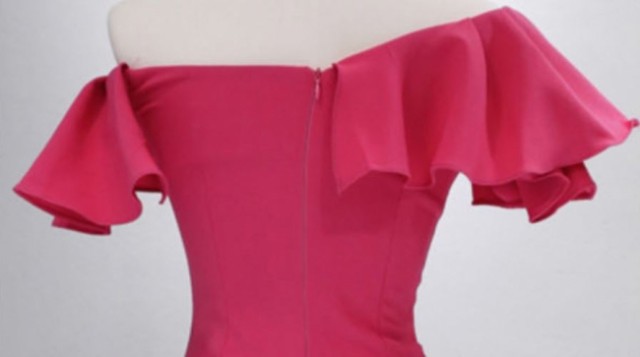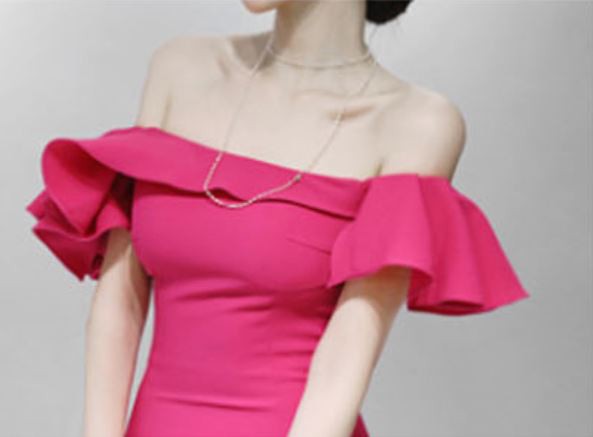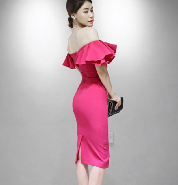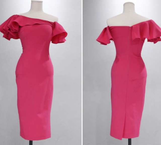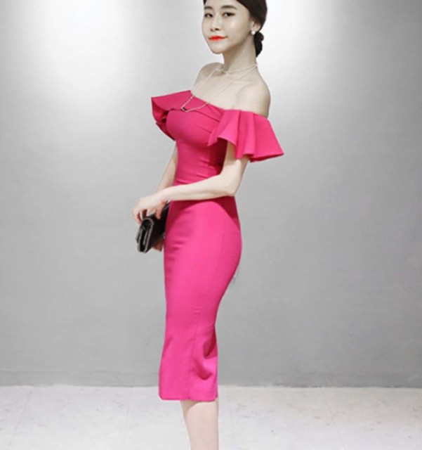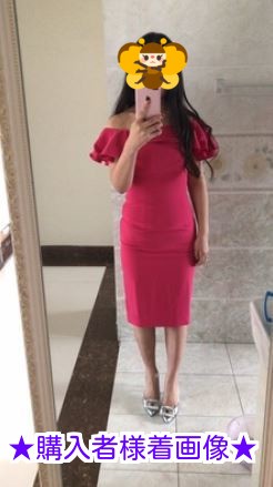 胸元が大きく開いたオフショルダーのパーティードレス☆
