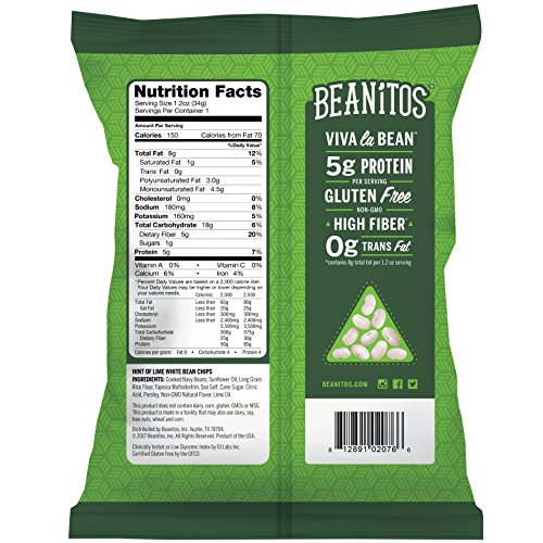 ReleaseDate : 2016-04-23 Studio : Beanitos Publisher : Beanitos Binding : Grocery Product Description The refreshing taste of lime and savory kick of sea salt makes these chips hard to resist! Beanitos hint of lime navy beans chips will keep you coming back for more. Our hint of lime chips are great with your favorite salsa or guacamole or great right out of the bag. Beanitos chips are packed with PROTEIN FIBER, always gluten free, non-GMO, corn free and taste incredible. The best part ? they’re made from wholesome beans! 0
