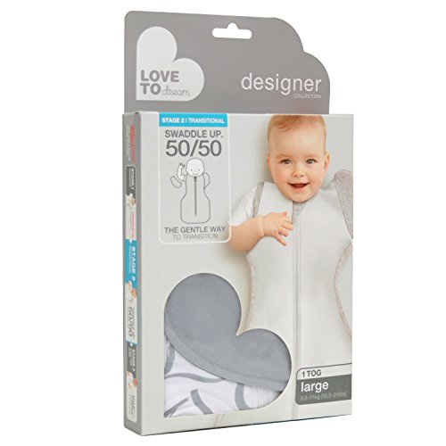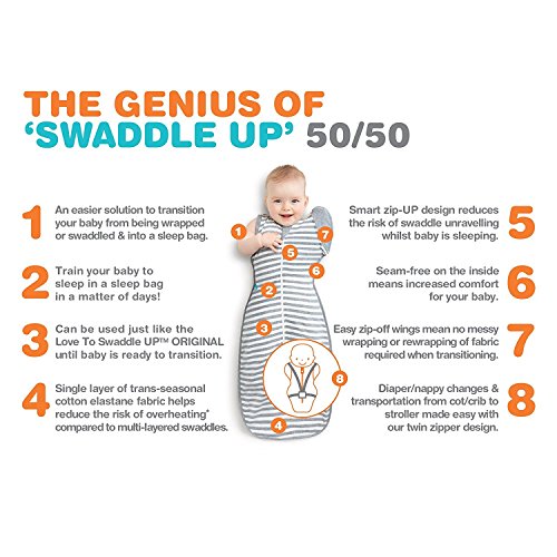 The Love to Dream Swaddle UP 50/50 is designed to transition your baby from swaddled sleeping to arms-free sleeping. Parents know that swaddling their newborns is important. Babies between two to three months grow fast, and when they are able to roll over or show signs that their startle reflex has diminished, they are ready to be transitioned from swaddling to arms-free sleeping. But this transition can sometimes be hard because babies may still have some startle reflex present and they are used to being swaddled. The Love to Dream team designed the Swaddle UP 50/50 - which is Stage 2 in Love to Dream's 3 Stage Sleep System - to make this transition easy for both baby and parents. The Swaddle UP 50/50 shares the same features as the Swaddle UP Original, but with the added versatility of patented zip-off wings. The Swaddle UP 50/50 will gently transition your baby from sleeping snuggly swaddled towards having the independence of sleeping with his or her arms free. The zipper design makes it easy to go back to the original swaddle design if your baby is not ready to transition. Once your little one is comfortable with both wings removed, the Swaddle UP 50/50 can be used like a snug and comfy wearable blanket, but with baby still feeling swaddled. Since 2008, Love to Dream has been finding simple, yet genius solutions to everyday parenting and baby needs. Our desire was always to create products that looked great and more importantly provided a solution to a parenting challenge. The best news of all is that our products work. So everyone in the family will achieve a better night's sleep. Functionality, usefulness and innovation are key for Love to Dream. It is vital that we offer products to parents (just like us) that will make their lives simpler and less stressful.Feature