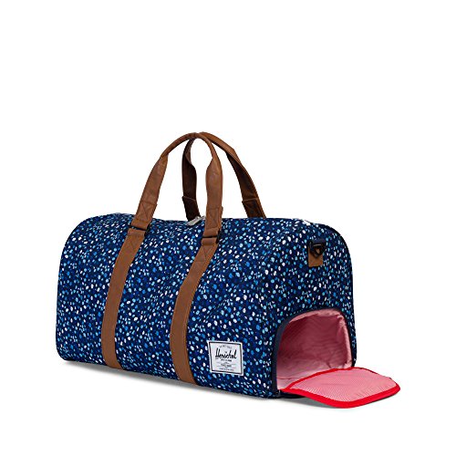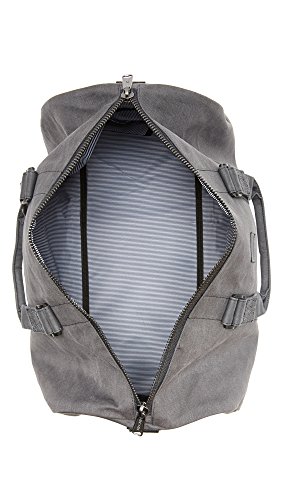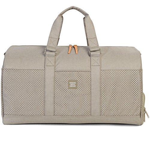 A spacious Herschel Supply Company duffel bag in rugged canvas. The sealed top zip opens the pinstripe-lined interior with 1 mesh pocket. A zippered shoe pocket trims the side. Optional, adjustable shoulder strap.