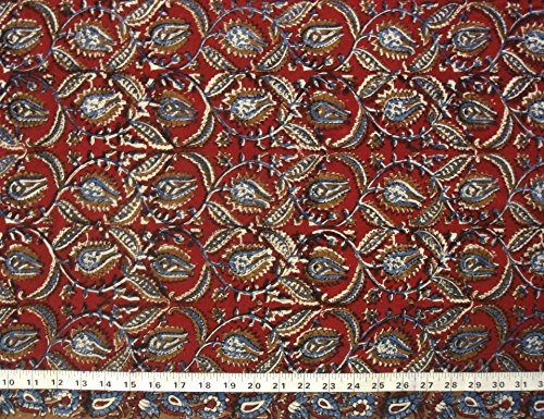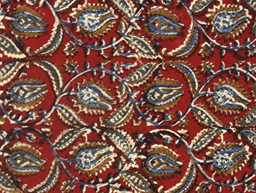 - Style : Traditional Indian Kalamkari Block Printed Fabric -Blue and Ochre Floral Pattern on Red Background. Please allow for some imperfections in terms of printing and dyeing as its a hand dyed and hand printed fabric and colors are all fruits and vegetable based