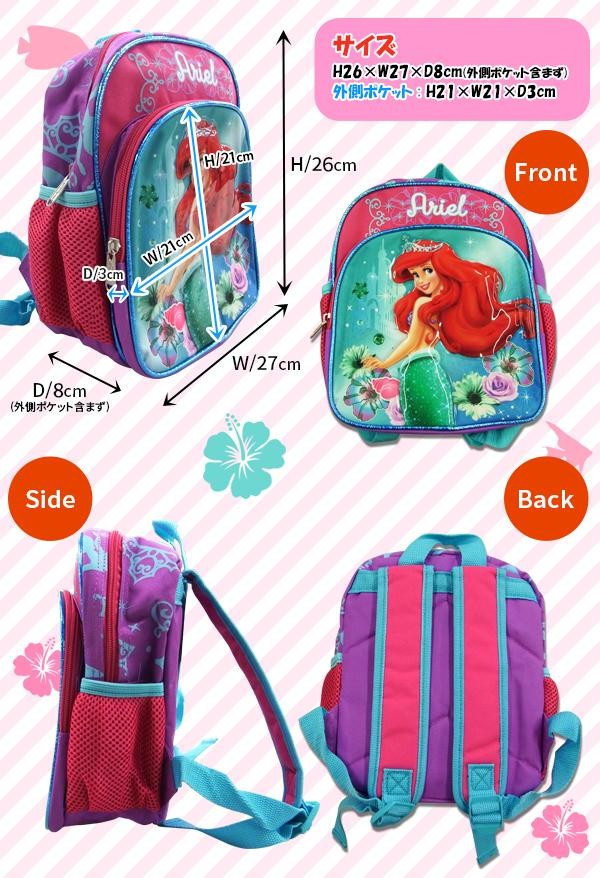 | アリエルのデザインが可愛い、お子様向けのリュックです。両サイドにもポケットが付いており、ちょっとしたものを入れるのに便利。国内ライセンス商品は落ち着いた柄・色合いが多いのですが、派手でかわいいデザインは海外輸入ならでは♪ |