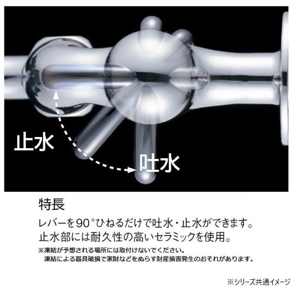 レバーを90度ひねるだけで吐水・止水ができます。止水部には耐久性の高いセラミックを使用しています。