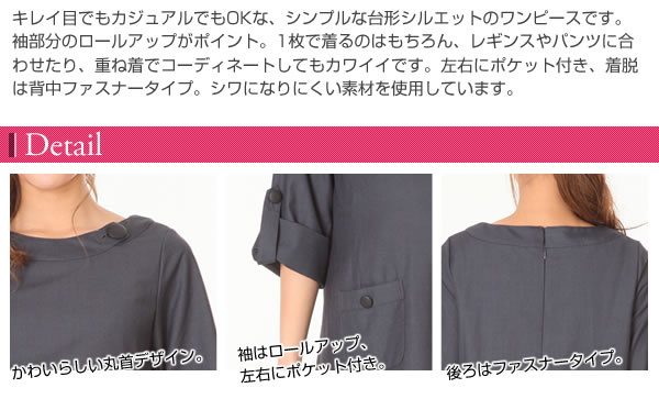 「ヴィナソール」から、キレイ目でもカジュアルでもOKなシンプル台形シルエットワンピが登場。袖部分のロールアップがポイント。1枚でも重ね着でもカワイイ。シワになりにくいのも◎