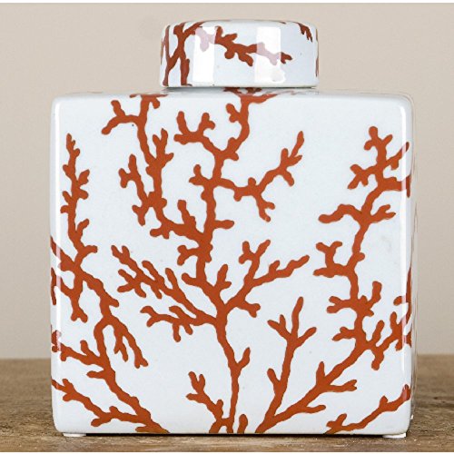 Home decor. White and Coral Porcelain Rectangular Jar. Dimension: 5 x 3 x 6. Pattern: Corals & Shells.