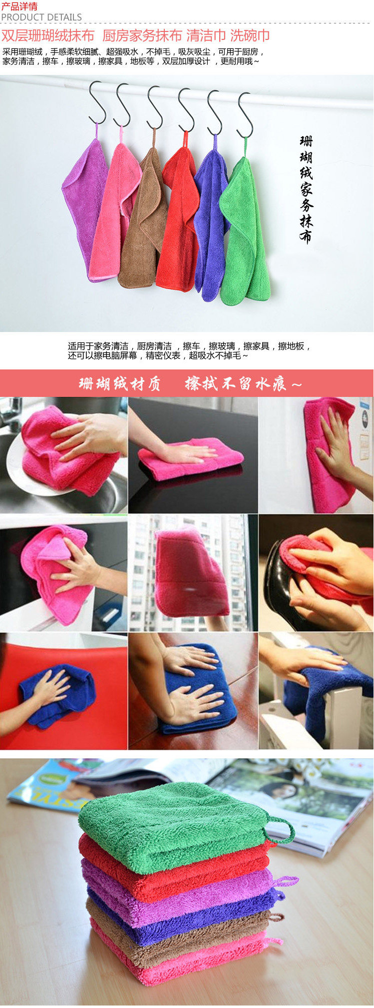 2.可用于厨房,家务清洁,擦车,擦玻璃,擦家具,地板等,双层加厚设计 ,更耐用哦~