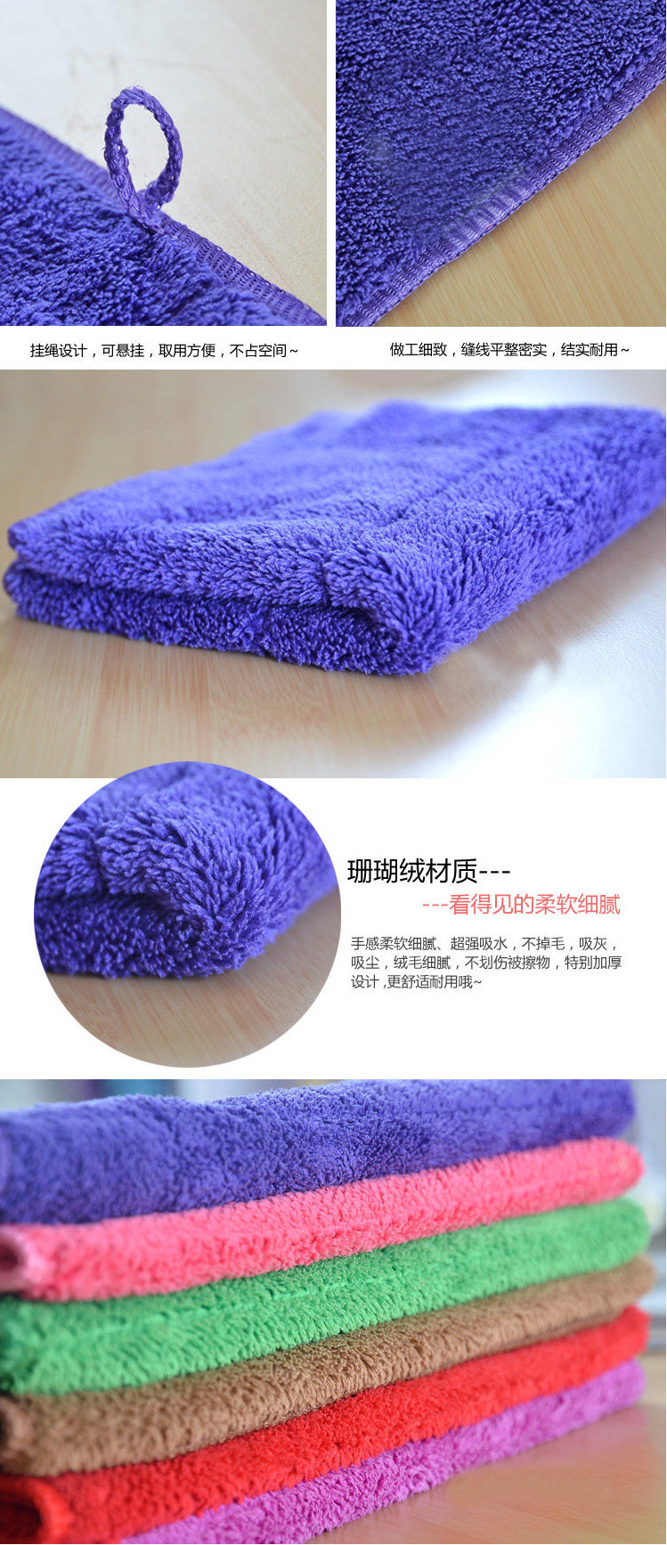 1.采用珊瑚绒,手感柔软细腻、超强吸水,不掉毛,吸灰,吸尘~