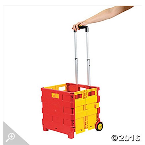 Product Description Fold Store Caddy. Protect your back and shoulders when carrying supplies by using this Fold and Store Caddy. From toting books to craft supplies, this durable plastic caddy is specially designed for safe, secure pushing and pulling when fully loaded. Features 2 easy-roll wheels, 2 built-in stops and telescoping handle. Also is handy for storing folders, books and binders. Folds down to the size of a briefcase for easy storage. Supplies not included. Cargo area, 14 Inch x 12 1/4 Inch x 11 5/8 Inch; folded cart, 17 1/2 Inch x 3 1/2 Inch x 16 Inch. 0