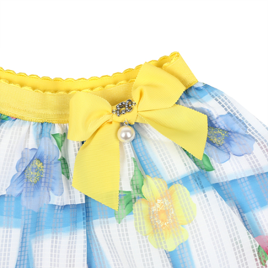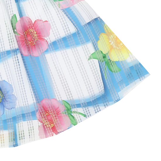 비치는 소재감에 블루칼라와 꽃 프린트가 산뜻하면서도 시원한 느낌을 주며, 허리에 옐로우 배색 밴드가 멋스럽습니다.