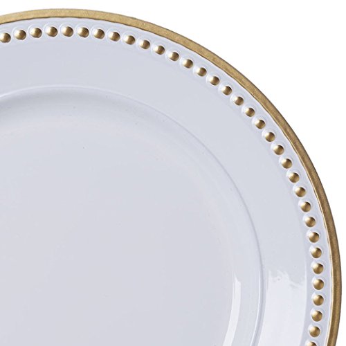 Product Description Charger plates, also known as service plates, under plates, or chop plates are the large decorative plates that are used to provide an elegant base setting for placing under other dinnerware during formal occasions, like; weddings, banquets, catered events, upscale parties, or in fine dining restaurants. Charger plates add elegance and style to any tablescape and give an enhanced and neat look to your special and traditional dishes. Use these gorgeous acrylic plates to add an interesting and dynamic element to your dinnerware. Our charger plates are an ideal choice to bring a modern twist to your dinner tables, oozing festive glitz and glam all around. Charger plates are used in multiple course meals as an elegant way to serve soup bowls, salad plates, and main dinner entrees to create upscale presentations for your guests. Add a dash of sophistication and voguish charm to your wedding feasts, holiday dinners, and parties with these shiny acrylic charger plates that will surpass the finest of dishware with their peerless sheen and white charger plates with gold rim and beads. Made from premium-grade acrylic, these durable and strong plates can withstand heat and weight efficiently. Inner ring measures 9" diameter Outer ring measures 13" diameter Acrylic material White Charger Plates with Gold Rim and Beads 1 order is for 1 set of 24 plates only. Additional decoration not included Charger plates cannot be used as dinner plate themselves 0