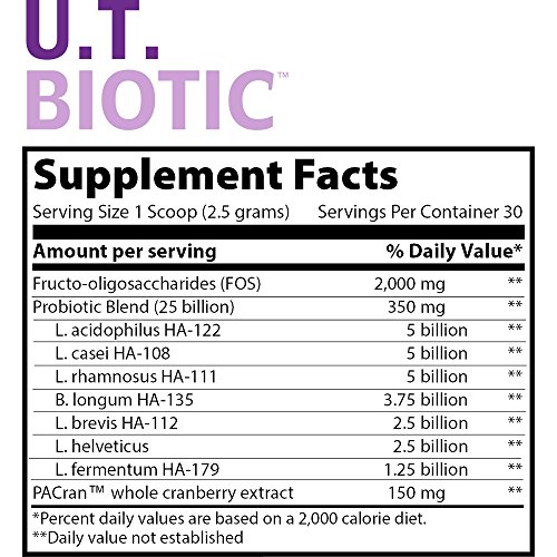 BYE BYE UTI: U.T. Biotic is designed to be your daily maintenance support for urogenital health. With 25 Billion Probiotics from 7 strains plus 150mg of PACran cranberry extract and 2 grams FOS per serving. The evidence from the available studies suggests that probiotics may be beneficial for preventing recurrent UTIs in women.