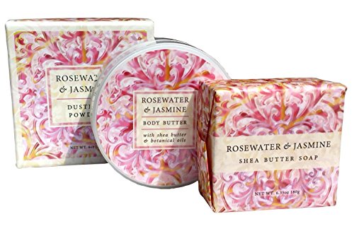 Greenwich Bay ROSEWATER JASMINE 3 Piece Beauty Gift Set of : BODY BUTTER, SPA SOAP, and DUSTING POWDER