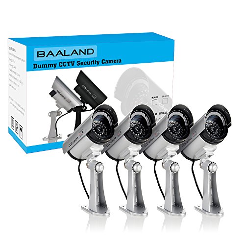 Fake Security Camera, Dummy CCTV Surveillance System with Realistic Red Flashing Lights and Warning Sticker (4, Silver)