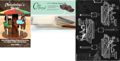 Cybrtrayd 'Train Engine Lolly Kids' Chocolate Candy Mold with Chocolatier's Bundle of 50 Lollipop Sticks, 50 Cello Bags, 25 Gold and 25 Silver Twist Ties and Instructions