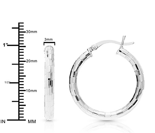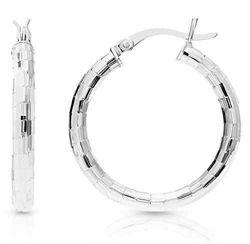 These beautifully designed hoop earrings feature an exquisite style. The tasteful, chic hoops have been finely crafted from 925 Sterling Silver and have click-top closures for a secure fit. The hoop earrings measure at 1 inch in diameter, making them lightweight and comfortable to wear throughout the day. The stylish, contemporary pair feature an intricate, rectangular faceted pattern. This detail makes these earrings especially suited to add an elegant touch to your look for a special occasion, yet simple enough to be an everyday accessory. This item is perfect for those for love fashionable, delicate jewelry and is sure to become a beloved favorite.Feature