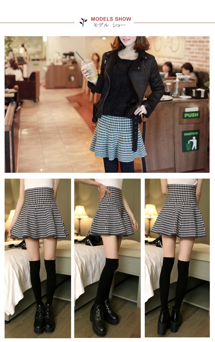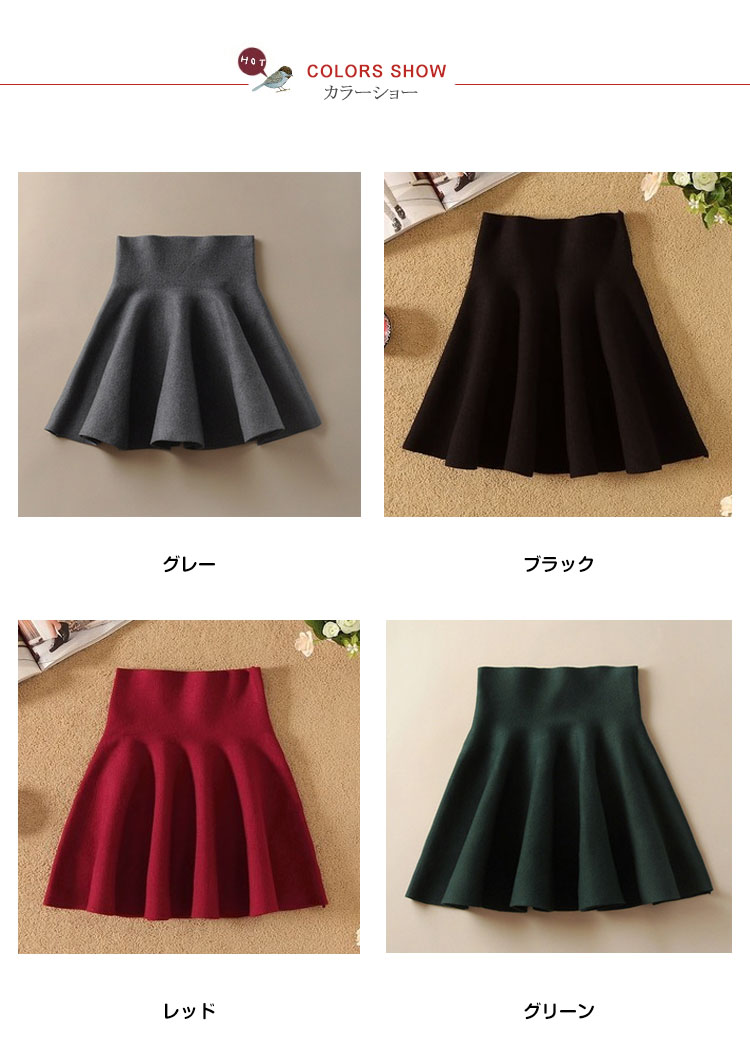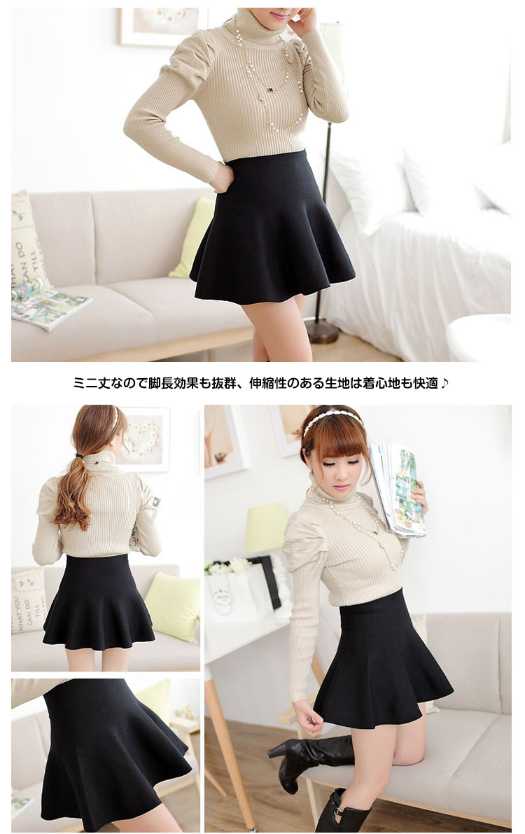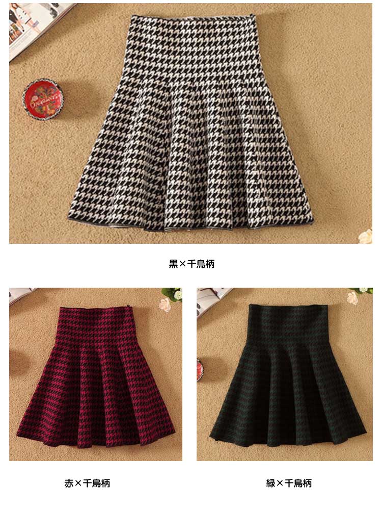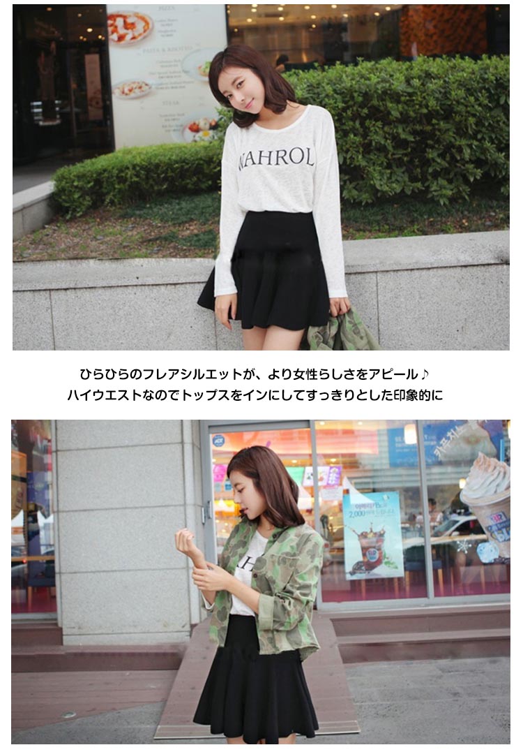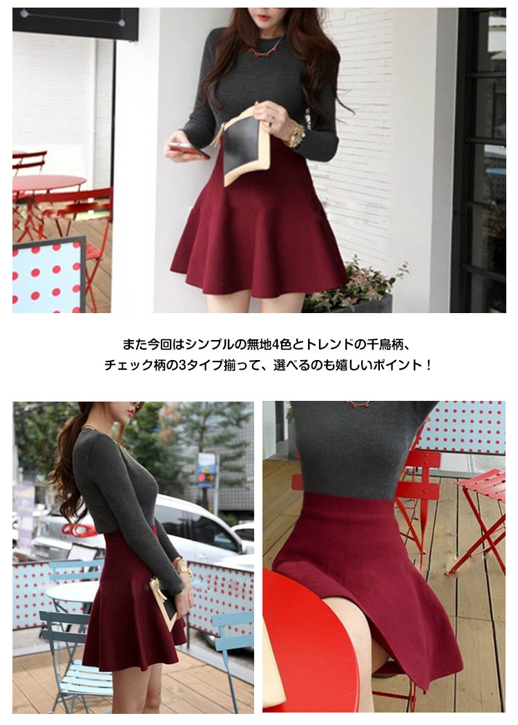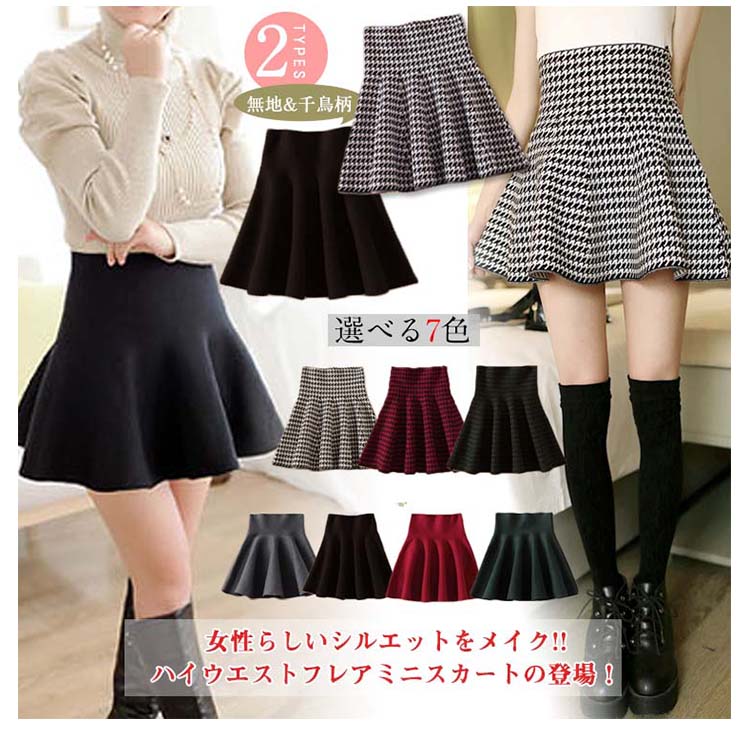 | 女性らしいシルエットをメイク!!ハイウエストフレアミニスカートの登場!ひらひらのフレアシルエットが、より女性らしさをアピール♪ハイウエストなのでトップスをインにしてすっきりとした印象的にミニ丈なので脚長効果も抜群、伸縮性のある生地は着心地も快適♪また今回はシンプルの無地4色とトレンドの千鳥柄、チェック柄の3タイプ揃って、選べるのも嬉しいポイント!程度よく厚みあるのでこれからの季節に絶対オススメな万能アイテム! | |