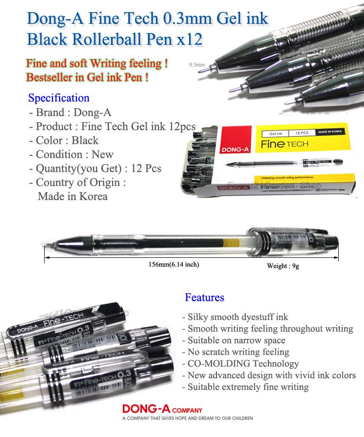 x12pcs Dong-A Fine Tech 0.3mm Gel ink Black Rollerball pen