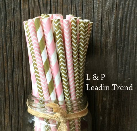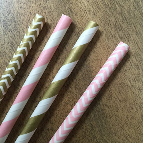 Gold and Pink Stripe and Chevron Paper Straws 7.75 Inches 100 Pack Gold, Pink, White