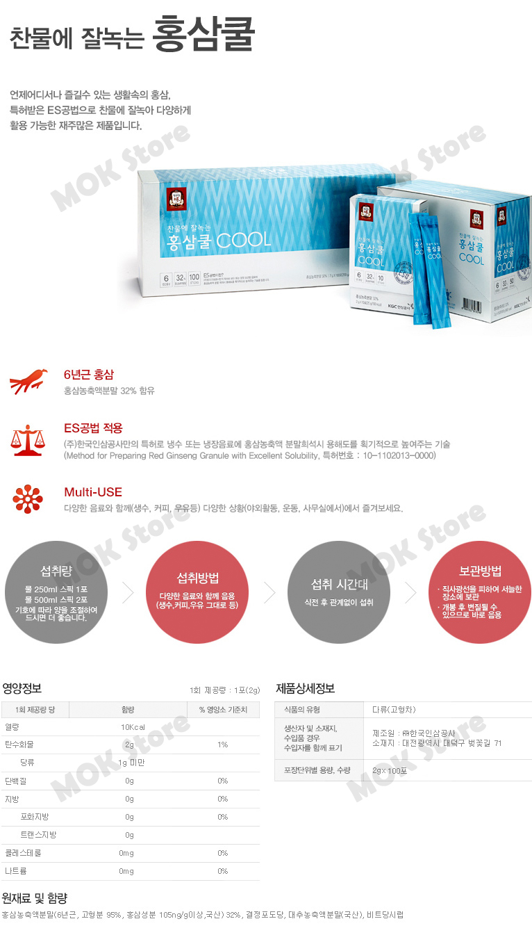 Korean Red Ginseng Extract Tea COOL is a powdered, caffeine-free, herbal tea, produced by the world's #1 ginseng company, Korea Ginseng Corp. Especially made with patented ES technology, Extract Tea COOL dissolves in cold water instantly.