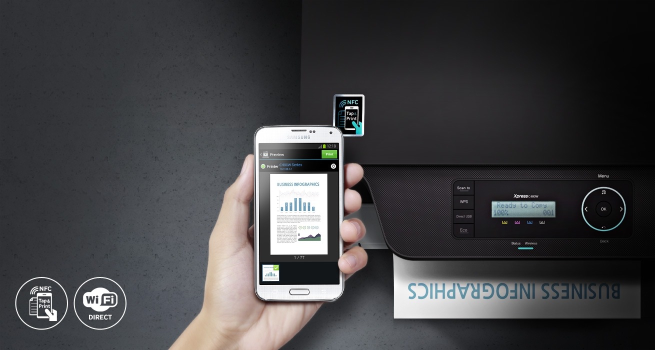 Mobile printing made easier with Samsung’s advanced NFC technology. Just tap a compatible NFC-enabled smartphone on the printer to automatically install Samsung’s free Mobile Print App (if not already installed on the phone), and you can connect to the device automatically.