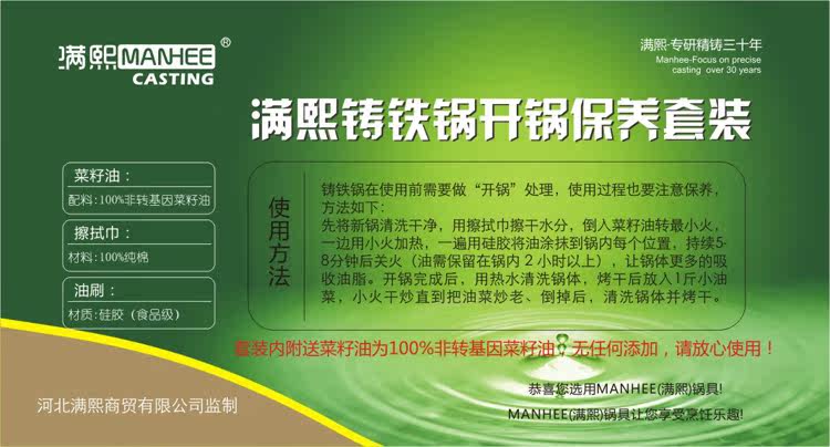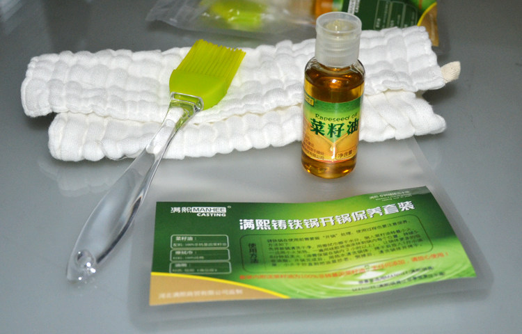 the first will be the new pan cleaning clean, with towel wipedry moisture, turn to low heat and pour in the canola oil, whilewith a small fire heated, again daub with silicone oil into the potin each location, sustained 5-8 minutes off the fire (oil would berequired for a period of 2 hours or more in the pot), pot body moreabsorption of fat. after the completion of the boil, use hot waterto clean the pot body, dried after placed in 1 of the rape, smallfire rapeseed sauteed fried until they get old, drained after, toclean the pot body and dried.